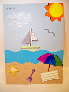 The theme for this ATC was travel and the destination should be obvious, so I decided to do a beach scene. I used sandpaper for the sand and cut out a tiny piece to make the "sandpile" near the shovel. The starfish is a rub-on and the "beach towel" was cut from patterned paper. I used a grey marker to make the birds and Stickles to make the cloud.